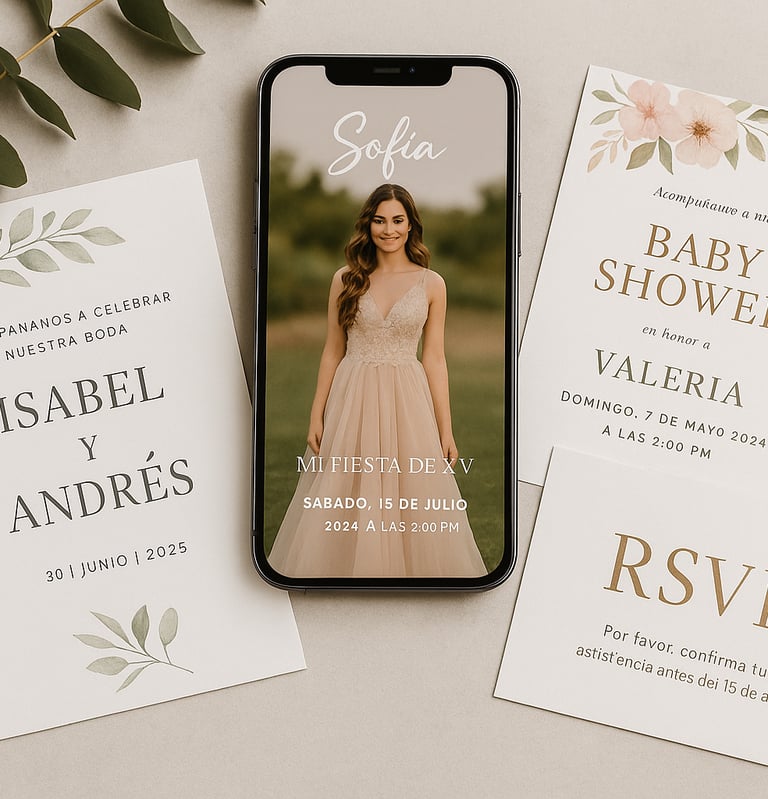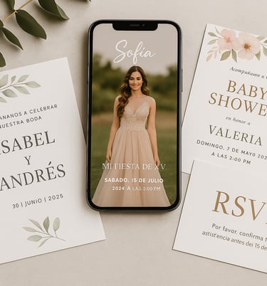 Diseño invitaciones digitales personalizadas para bodas, XV años, baby showers y eventos especiales. Cada invitación incluye diseño elegante, visualización desde cualquier dispositivo y entrega rápida para compartir fácilmente por WhatsApp, correo o redes sociales.